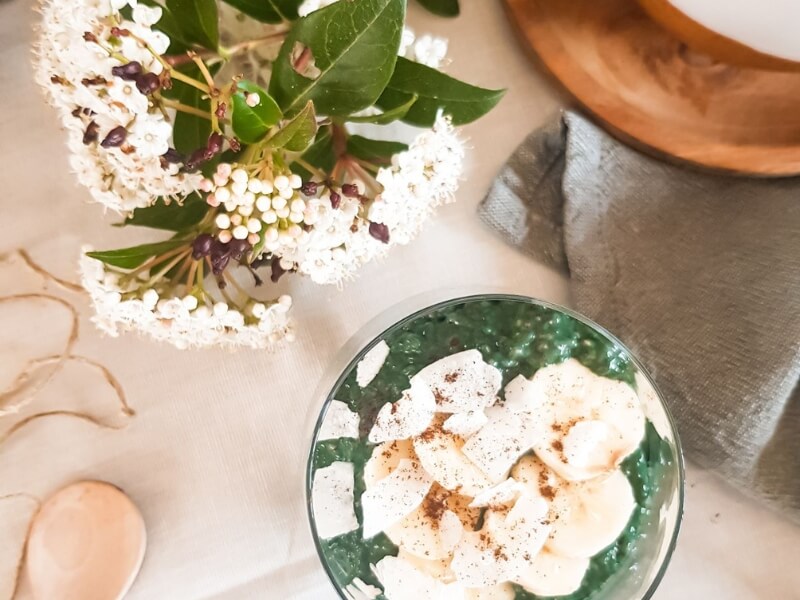 Dans le cadre d’un partenariat en 2023, Amandine la fondatrice de Rayonne de Vitalité a concoctée spécialement pour les futures mamans, post-partum et allaitantes, plusieurs recettes délicieuses à base de spiruline, fraîche et surgelée. Cette jeune maman adepte du « mieux manger » et conseillère en nutrition, nous a fait cadeau de plusieurs de ses recettes. Et en voici une délicieuse, pour votre prochain petit déjeuner healthy : Le pudding à la spiruline et à la vanille.