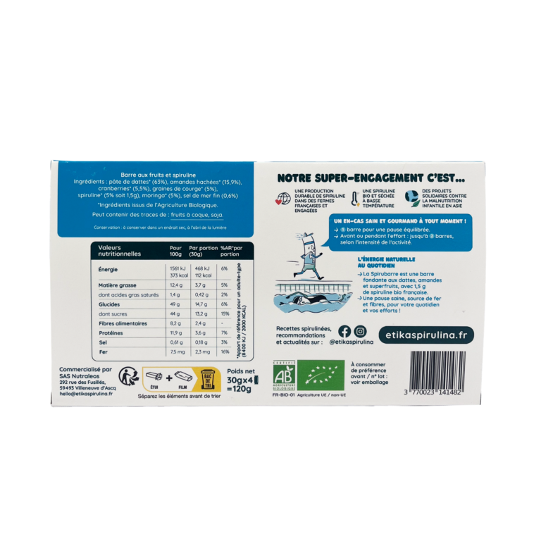 - Chaque barre contient 1,5g de spiruline bio française, soit la portion journalière recommandée !