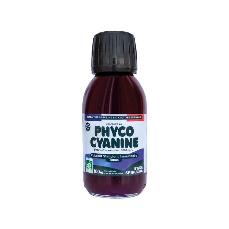 La phycocyanine est un pigment antioxydant naturellement présent dans la spiruline. Présente aux côtés de la chlorophylle, elle participe à la photosynthèse de la spiruline et lui donne sa couleur bleu-vert caractéristique. Elle est reconnue comme puissant stimulant immunitaire. Issue de notre spiruline bio cultivée en France, la phycocyanine est une source d’antioxydants, qui contribuent à protéger le corps des conséquences contre le stress oxydatif. Extraite selon un procédé doux pour préserver son profil nutritionnel, notre phycocyanine liquide garantit une haute qualité et une absorption optimale, avec une haute concentration à 5000mg/L.