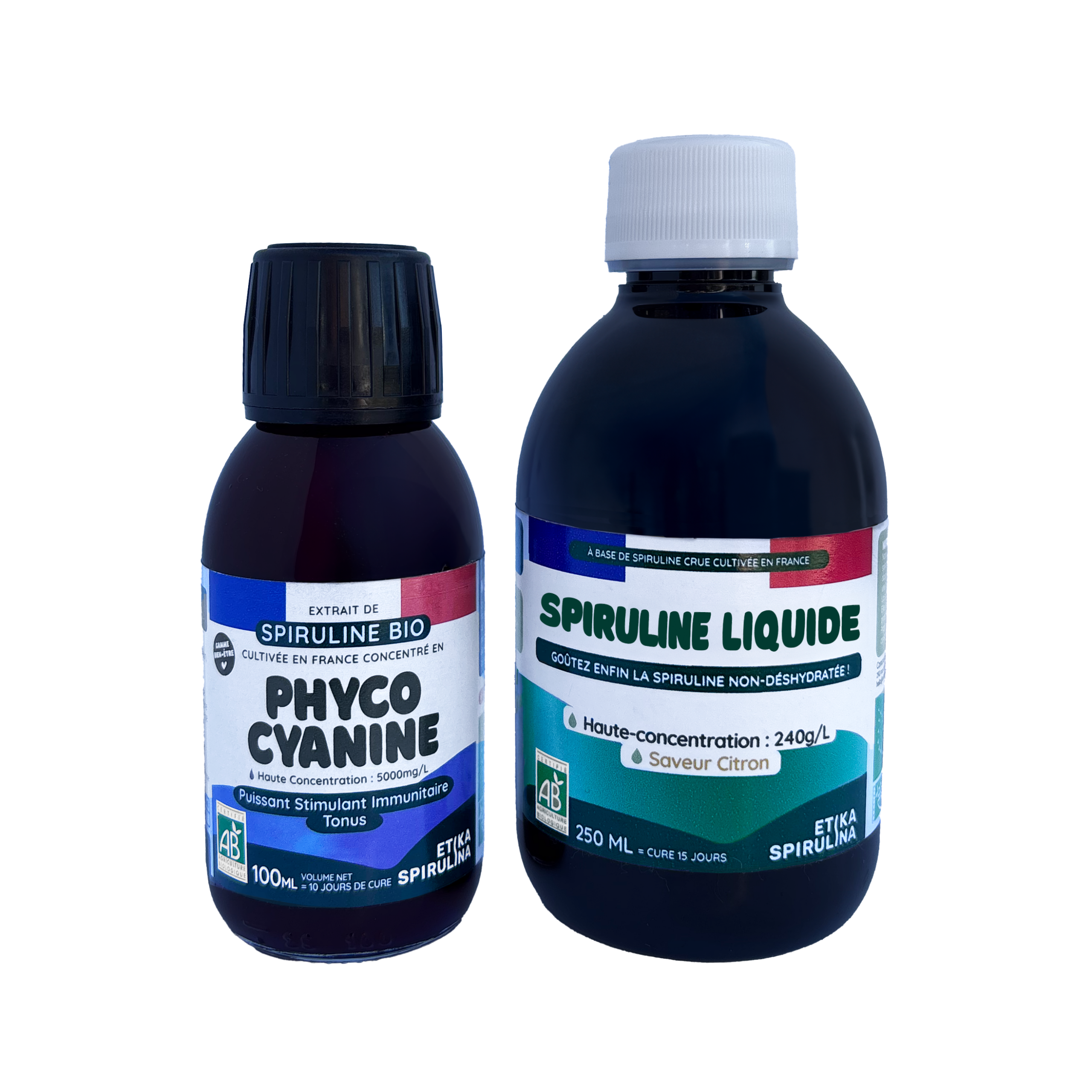 Le duo énergie naturelle associe la spiruline fraîche liquide saveur citron et la phycocyanine, offrant ainsi une approche complémentaire et simple à intégrer au quotidien. Il est idéal pour accompagner les périodes de fatigue ou soutenir votre vitalité naturellement, avec une cure d’un mois.