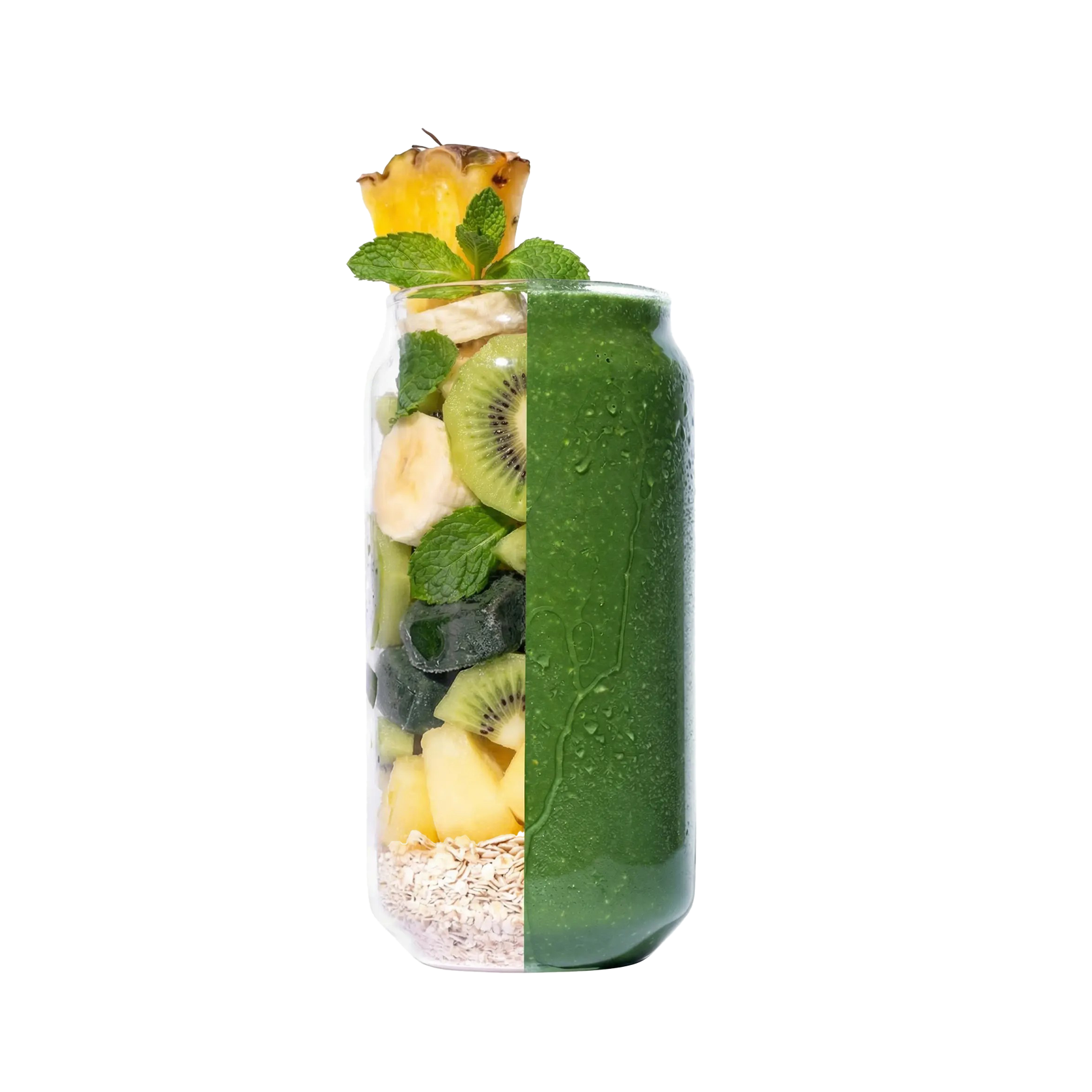 Ananas (58.31%), banane (33.20%), kiwi (5.50%), menthe (2.47%), spiruline (0.52%).